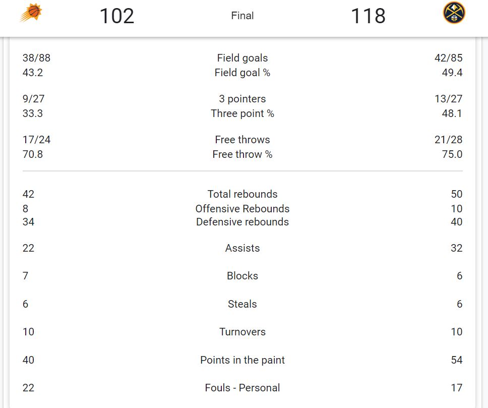 Just before the 7-minute mark in the fourth quarter, Nikola Jokic had his tenth assist of the night, making it ten playoff triple-doubles by a center, passing the late great Wilt Chamberlain who had recorded nine. When Jokic moves the ball around and thus the scoring, Denver plays like the top seed in the West. Denver keeps the pressure all fourth quarter until the 4-min mark, when the Suns put their bench in. 118-102 leads to a 3-2 Denver series lead.