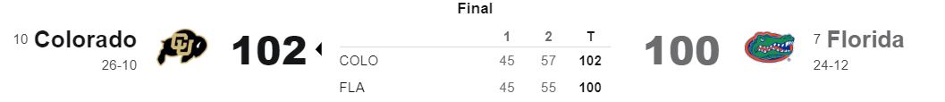 Exciting, nerve-wracking games are becoming the norm for the Buffs in March. This 102-100 victory against Florida is not all that different from the exciting and hard-fought victory against Boise State on Wednesday night. Tonight, all five starters scored in double digits as the Buffs move onto the Round of 32. They’ll play the 2-seed Marquette on Sunday.