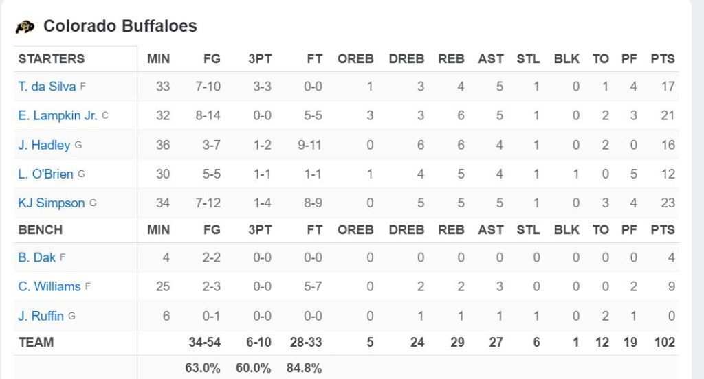Florida hit more threes, had more steals, more blocks, and caused the Buffs to turn it over. However, it came down to winning the rebound battle, assists battle, and shooting 63% from the field. It helps CU when you have highly underrated KJ Simpson hitting big shots at the end of each quarter to seal the deal.