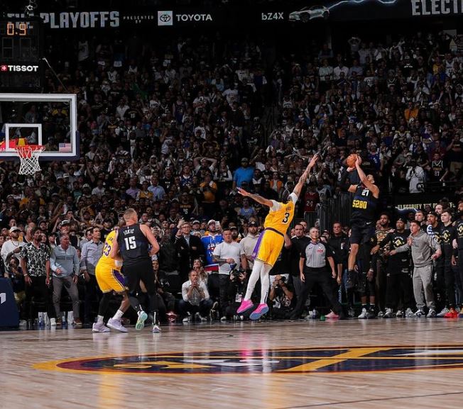 With 12.1 seconds left, Michael Porter Jr. grabs his ninth rebound and passes the ball to Jamal Murray. Murray brings the ball down the court, Kentavious Caldwell-Pope sets a pick and moves away. Jokic moves towards Murray, backs off, and James and Davis switch who they’re defending. Murray dribbles, moving towards the baseline. Jamal Murray creates a bit more space from Davis as he shoots a fadeaway with 0.1 seconds remaining.