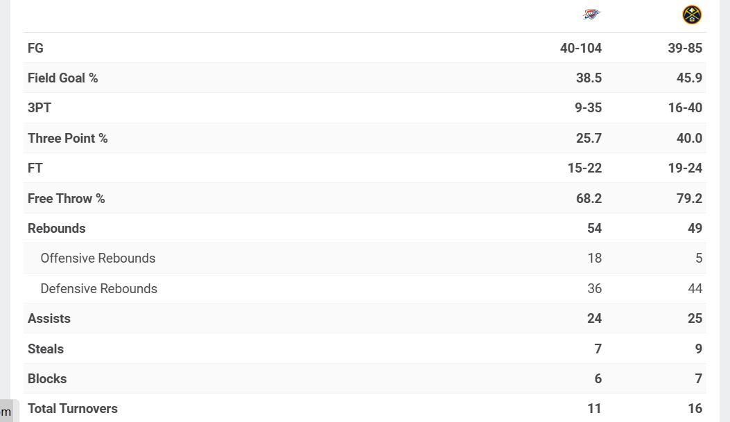 Denver as a team buckled down in the waning minutes of the fourth and the entirety of overtime. However, the consistent pressure on SGA and forcing other guys to score did not work for OKC in the second half. Christian Braun’s eight points and seven rebounds will mislead those reviewing this game because he harassed SGA. The MVP candidate did not have a good first half. The fourth and overtime quarters continued to be rough for SGA with missed buckets, and his teammates followed suit. Denver’s defense has to stay at this level of effort for the remainder of the series.
