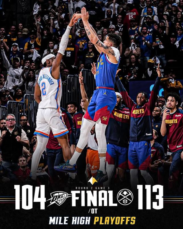Murray’s dive for the ball to keep it in Denver’s possession is emblematic of this overtime: the Nuggets are hustling for it, and the Thunder are tired. This Denver team shows real grit tonight as they hold OKC to two points in overtime. Nuggets win 113-104 and gain a 2-1 series lead.