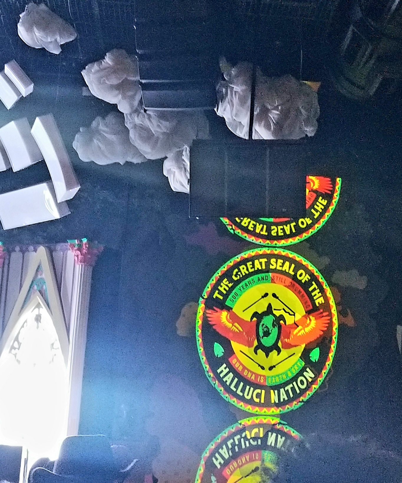 It has a feeling of a smaller venue smooshed together with the altar of a Christian-related church. There’s some stain glass window-esque views behind the performance area, and the walls are tree-like. For The Halluci Nation’s event, the group brought along some visuals. Bear Witness worked on this mesmerizing scenes and images.